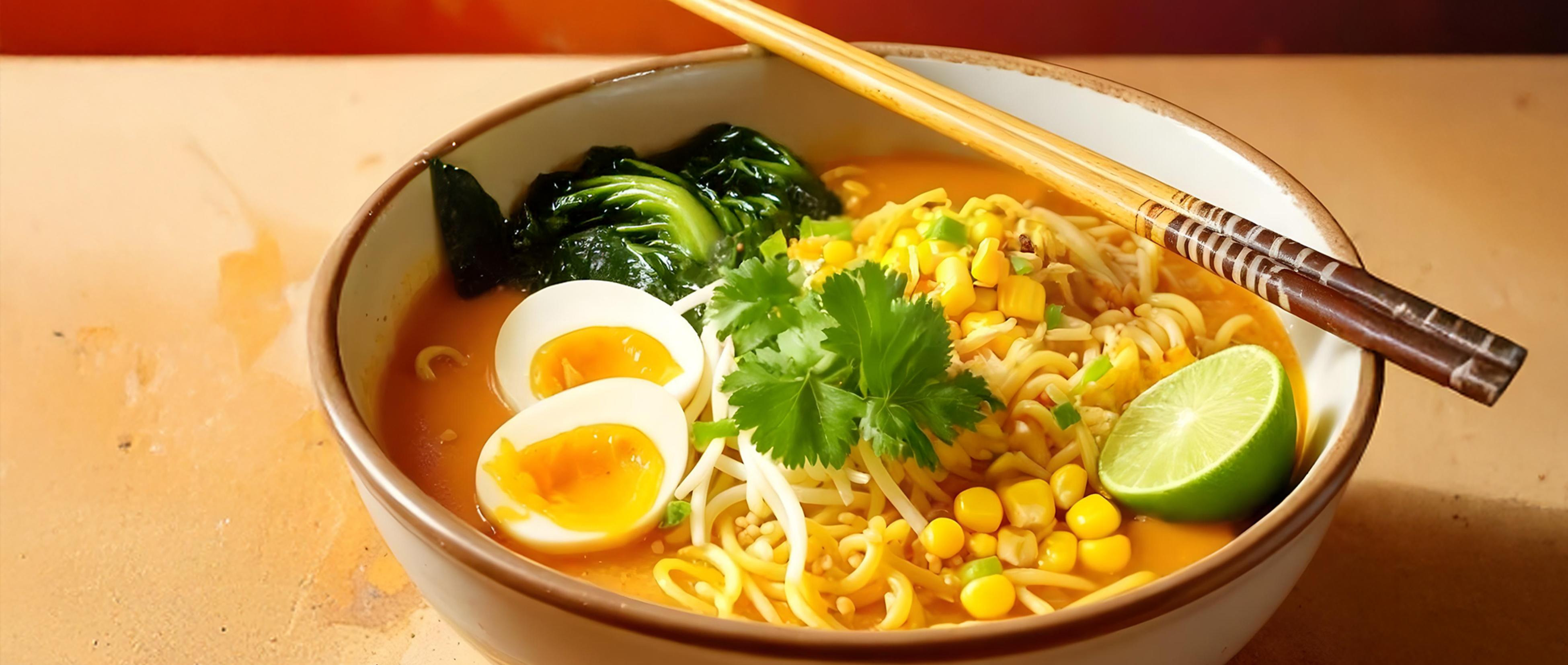 Faites cuire les nouilles comme indiqué sur l’emballage et égouttez-les. Répartissez dans quatre bols. Versez la soupe par-dessus. Ajoutez le maïs et le pak-choï. Terminez avec des œufs durs coupés en deux, de la coriandre, des quartiers de citron vert et le reste de l’huile de chili.