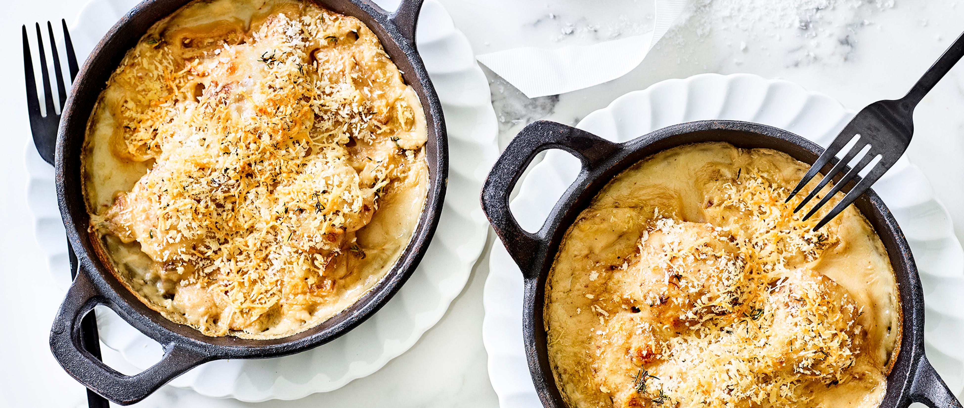Voeg de coquilles toe aan de saus en verdeel ze over zes vuurvaste schaaltjes die in de oven mogen of in lege coquilleschelpen. Bestrooi met het pankomengsel. Zet onder de hete grill tot je een mooi goudbruin korstje hebt.