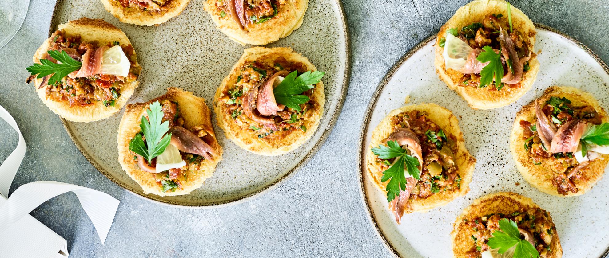 Geroosterde briochetoast met olijventapenade en ansjovis