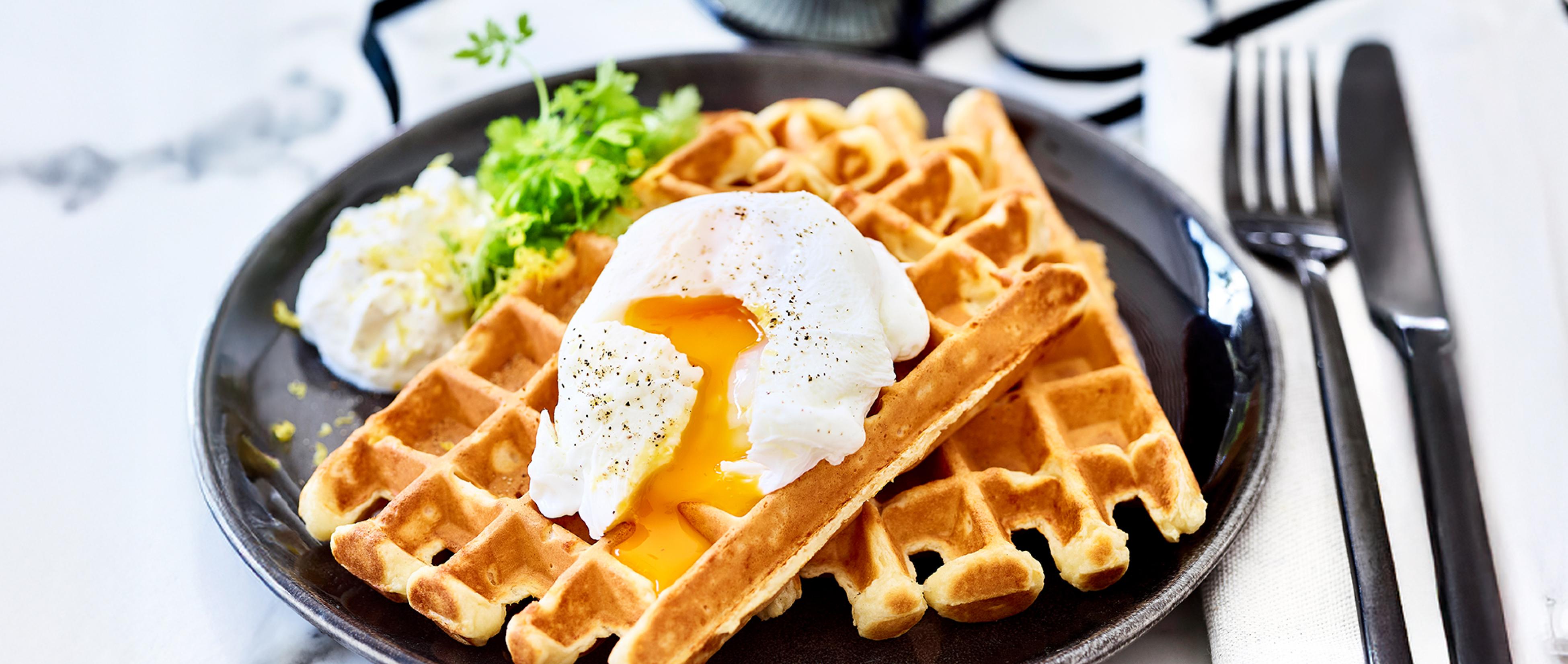 Leg op elk bord een wafel met daarop een beetje citroenricotta en een gepocheerd ei.