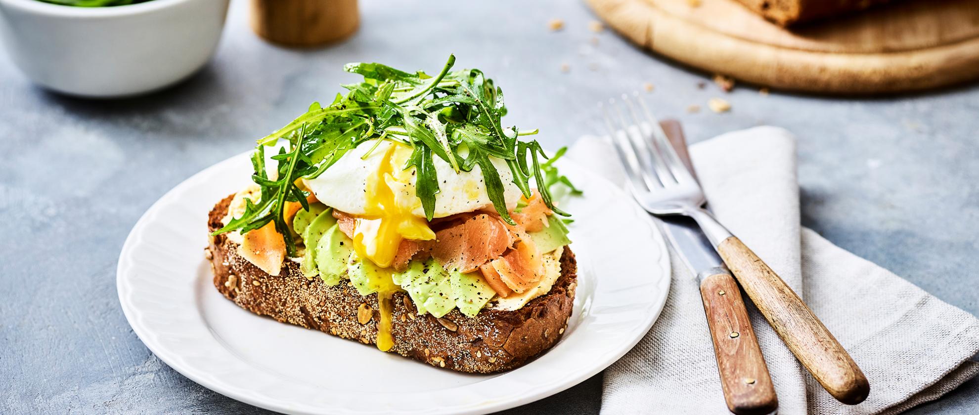 Houthakkersbrood met hummus, avocado, gerookte zalm en gepocheerd ei