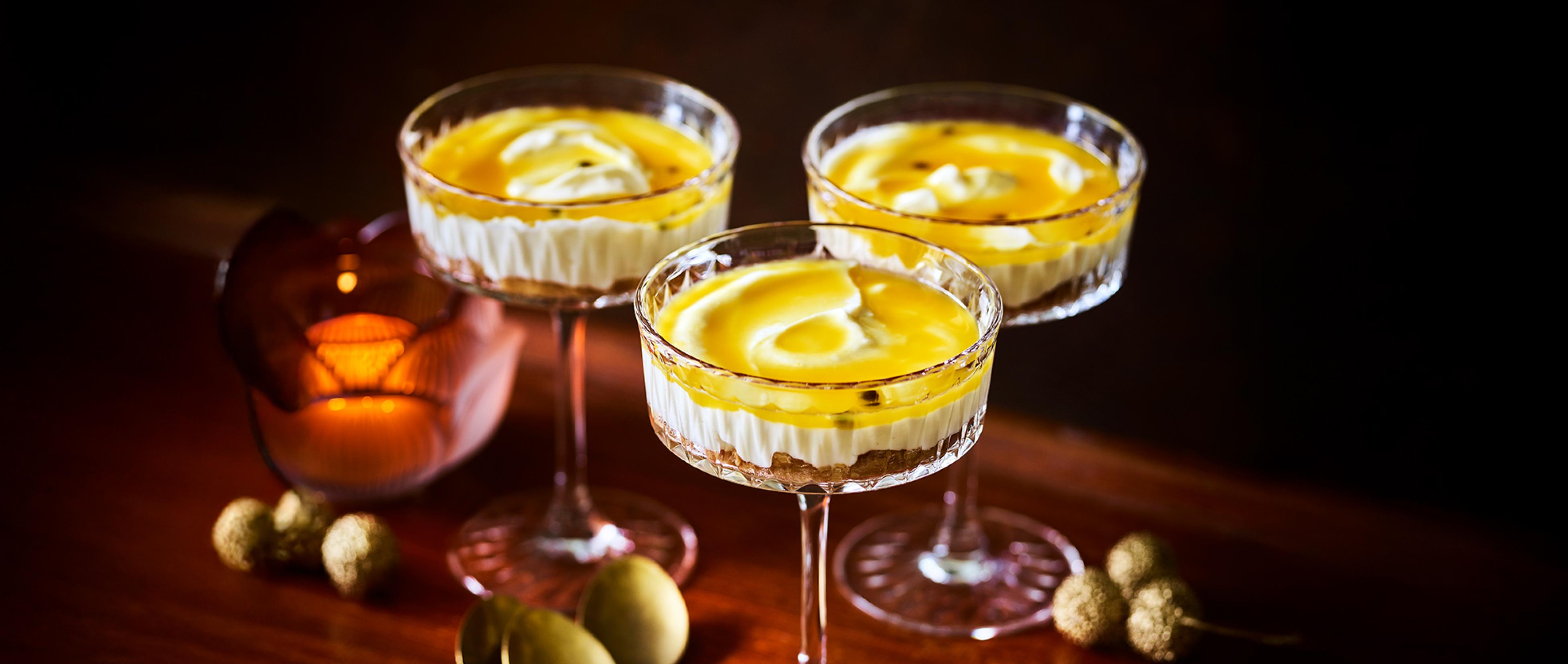 Snij de passievruchten doormidden en schep het vruchtvlees eruit. Meng met het sinaasappelsap. Giet door een zeef.