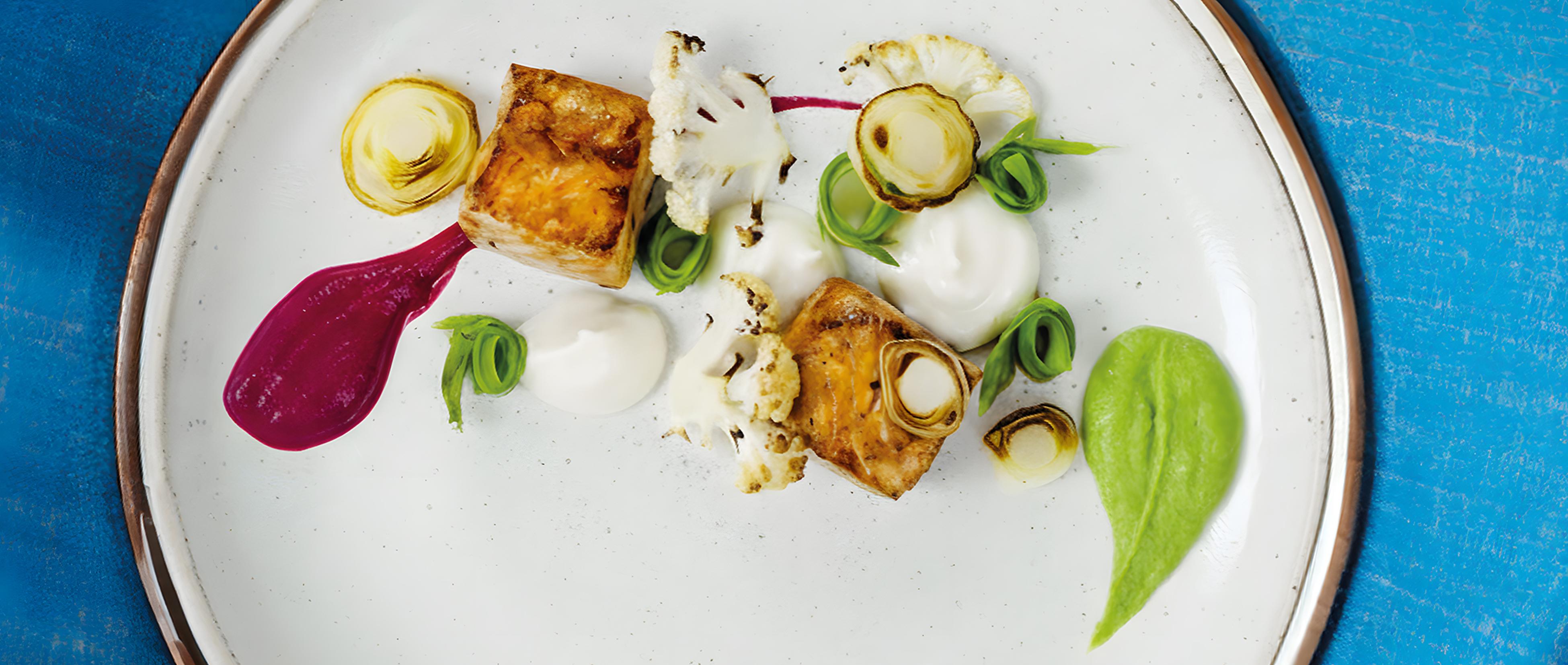 Schelvis met erwtencrème, bietencrème en geroosterde bloemkool