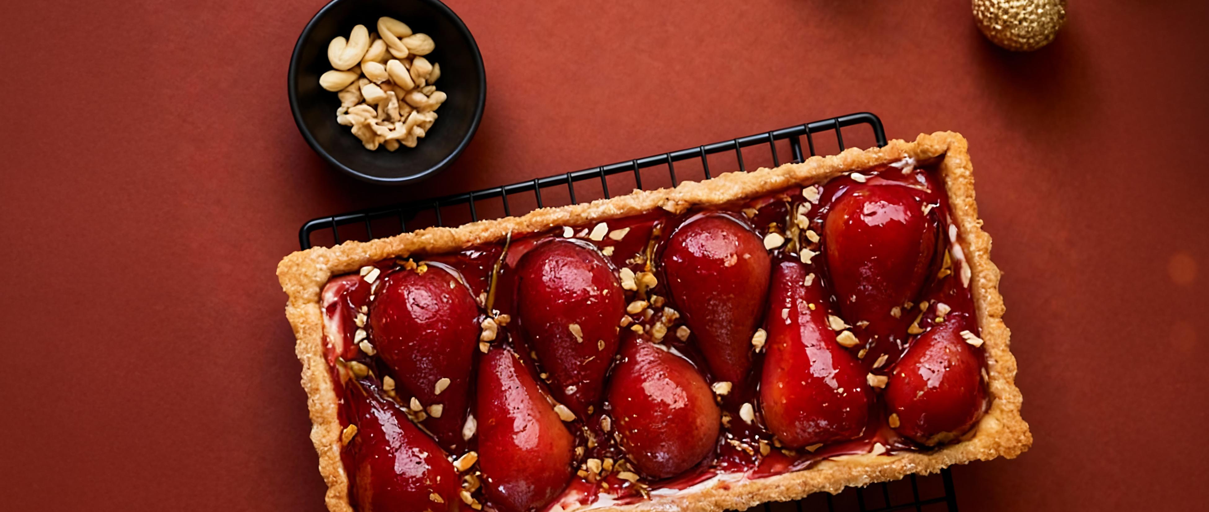 Meng de roomkaas met de bloemsuiker en de geraspte sinaasappelschil. Bestrijk de bodem van de taart met dit mengsel. Schik hierop de gehalveerde (of in kwartjes gesneden) peren. Overgiet met een beetje wijnsiroop en bestrooi met de grof gehakte noten.