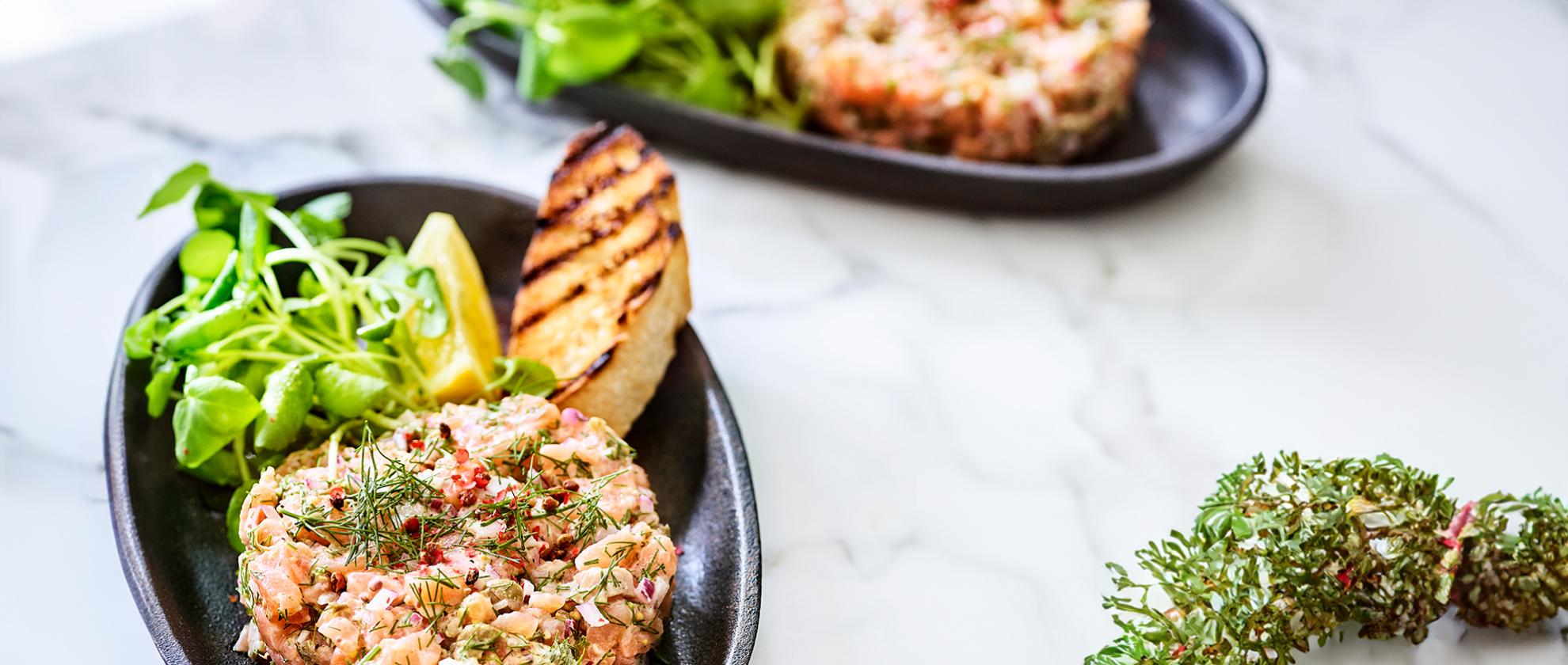 Gebruik een serveerring om op zes borden zes torentjes tartaar te serveren. Werk af met extra dille en plakjes citroen.