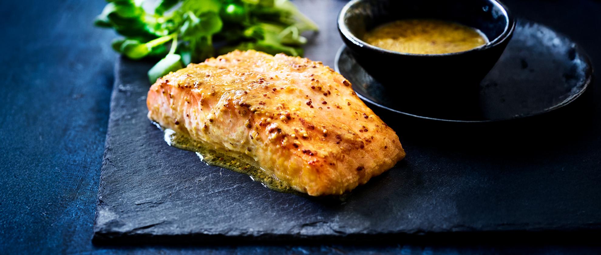 Dans un bol, mélangez la moutarde à l’ancienne, le jus d’orange et le miel. Versez-en quelques gouttes sur les filets de saumon. Placez la lèchefrite pendant 25 minutes dans un four préchauffé à 180 °C. Badigeonnez le saumon à mi-cuisson avec le glaçage restant sur la lèchefrite. Utilisez un pinceau de cuisine