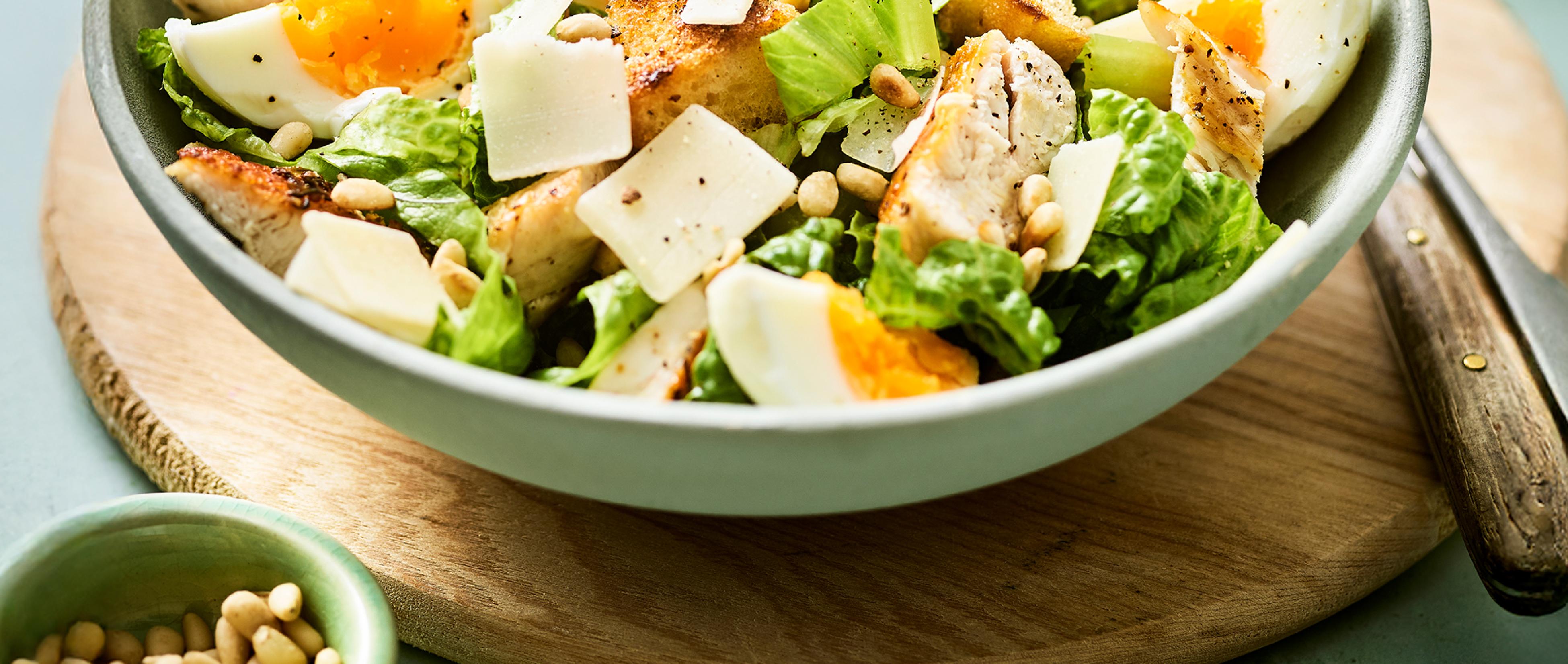Werk af met de pijnboompitten. Serveer met de Caesar dressing.