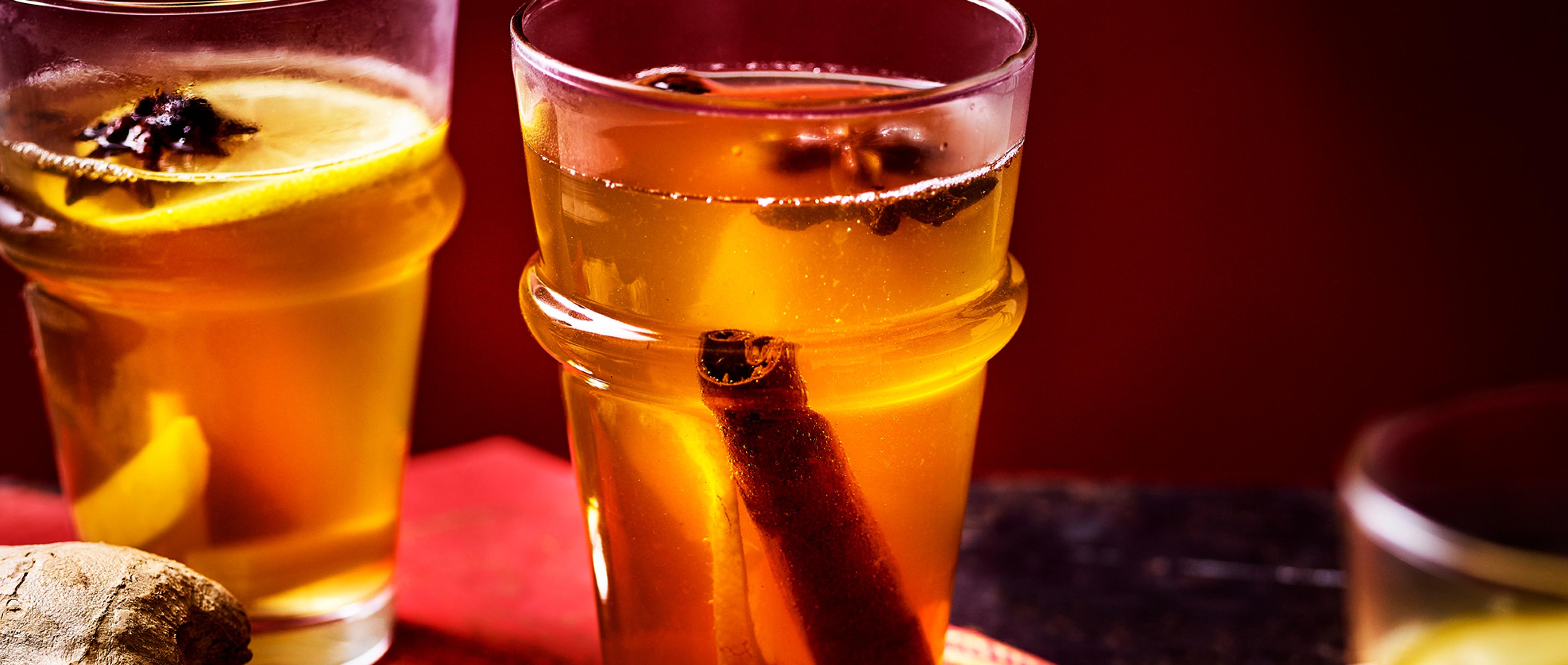 Garneer met plakjes citroen, kaneelstokjes, plakjes gember en steranijs.