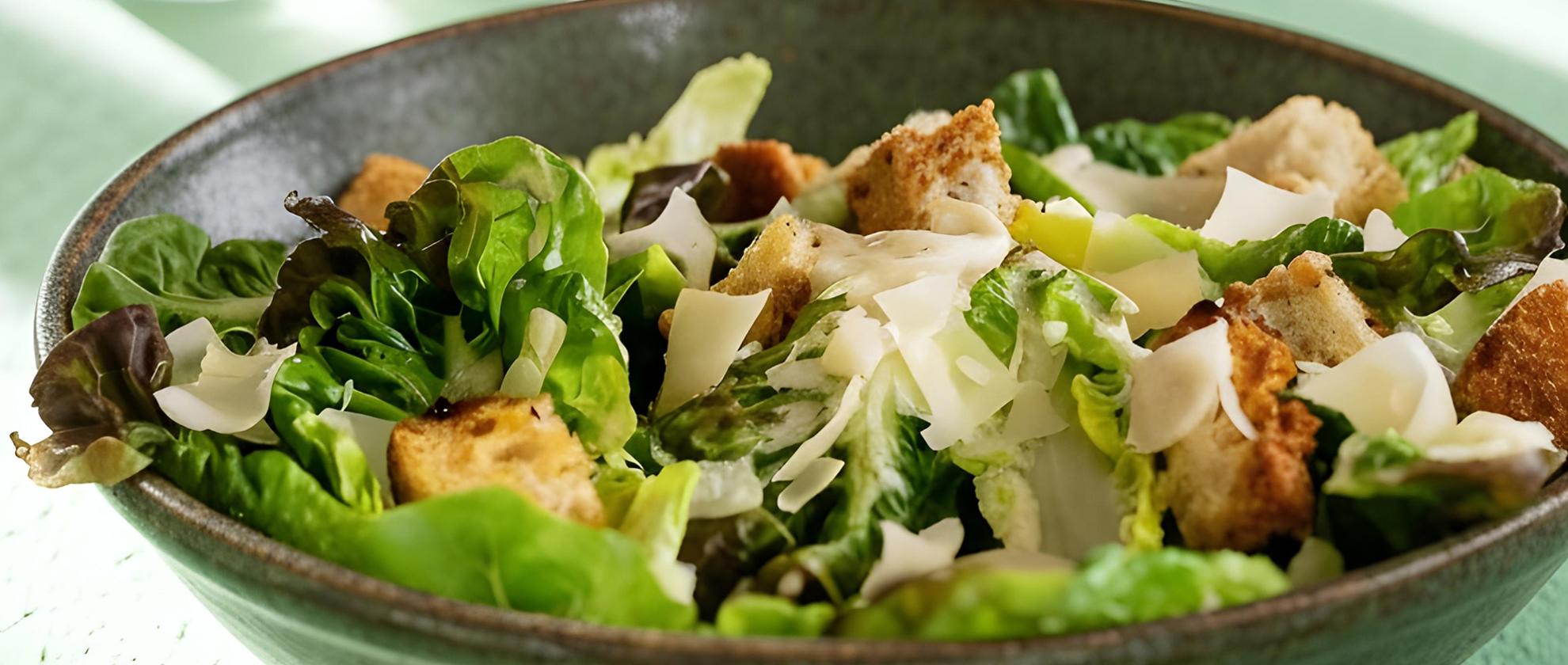 Verdeel de Romeinse sla in stukjes en meng met de croutons en de parmezaanschilfers.