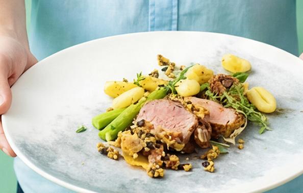 Schik op elk bord twee schijven gegrilde knolselder. Bestrijk met de erwtenpuree en verdeel hierover de gebakken champignons. Werk af met twee fijngesneden lente-uitjes.