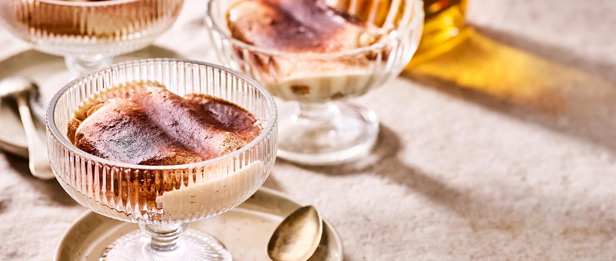 Meng in een ondiep schaaltje de koffie met de whisky. Neem een rechthoekige, diepe schaal of zes glazen schaaltjes. Dompel de helft van de boudoirkoekjes één voor één in het koffiemengsel en leg ze op de bodem van de schaal of de glazen schaaltjes. Verdeel hierover de helft van het mascarponemengsel. Dompel nu de rest van de koekjes in het koffiemengsel en leg ze erbovenop. Schep nu de rest van het mascarponemengsel erover.